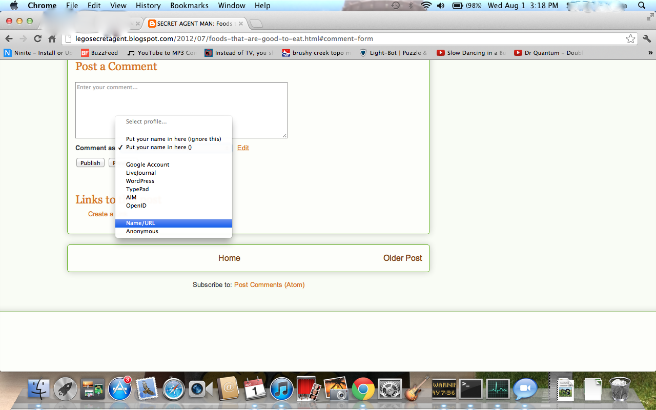 Step 3: Click on the drop down box next to "Comment As". Scroll down and select Name/URL. (or you can choose anonymous if you so choose, this is usually reserved for TROLLS).